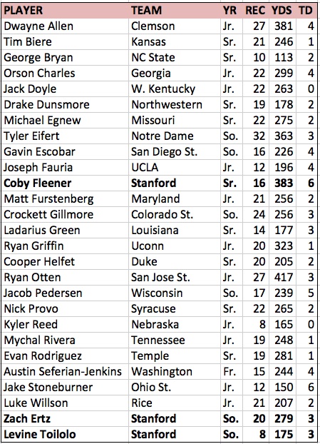 If Fleener continues at his current pace, he'll become the first Stanford player to win the John Mackey Award. His challengers through the first half of the season include the likes of Clemson's Dwayne Allen and San Jose State's Ryan Otten, both of whom were named to the award's midseason watch list (see table below). As far as I can tell, there's nothing in the award criteria that prohibits more than one player from a school being named to the watch list, but Fleener is the Cardinal's only representative. I've added Ertz and Toilolo's numbers to the end of the table. As you can see, both players are worthy of inclusion.