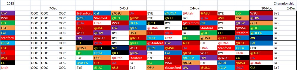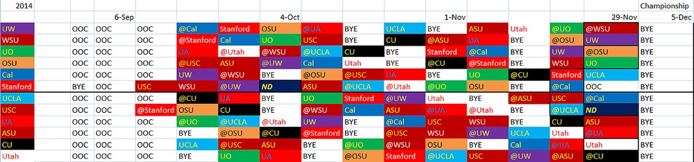 In conclusion, this little exercise of mine made me discover some very interesting things. First, Cal and UCLA would need to play each other on the final weekend of the season after Thanksgiving unless one can get a waiver. Second, Stanford and USC would need to play an OOC game every other year on that same weekend if they keep up their Notre Dame games. Third, Stanford and USC must play each other during the first three weeks of the conference due to the Three Week Rule, unless there are 14 weeks in the season.