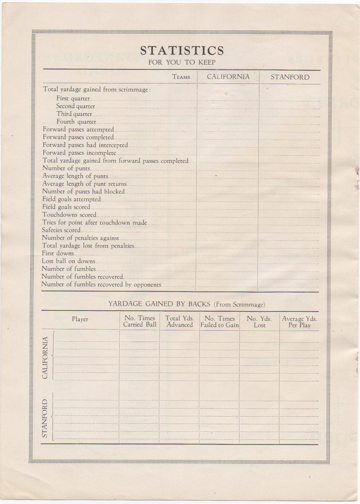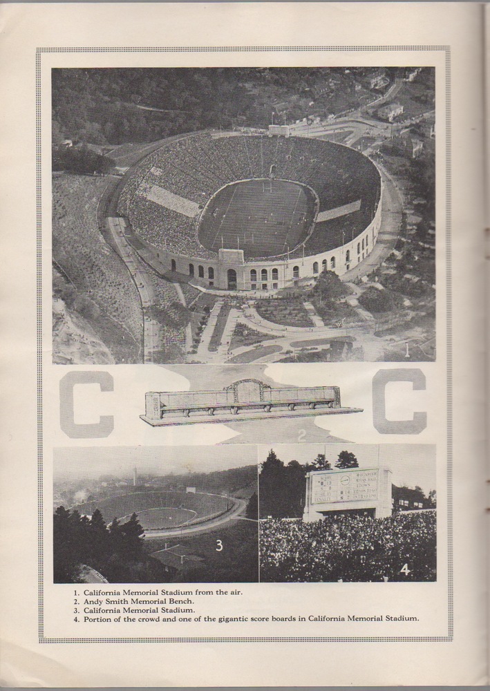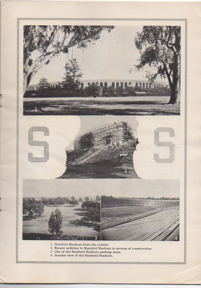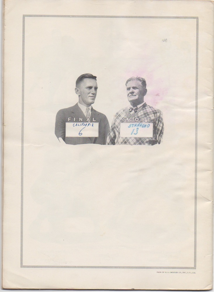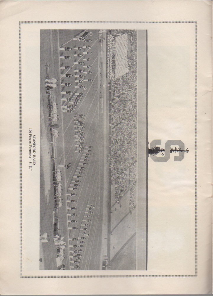 Continuing the Big Game Cover Project, I present the 1927 program. Stanford defeated Cal, 13-6, in front of a record crowd of 88,000 at Stanford Stadium. Pop Warner's squad finished 4-0-1 in the Pacific Coast Conference and went on to defeat Pittsburgh in the Rose Bowl. Check out a few inside pages after the jump, including one that depicts Stanford's then-traditional marching band.