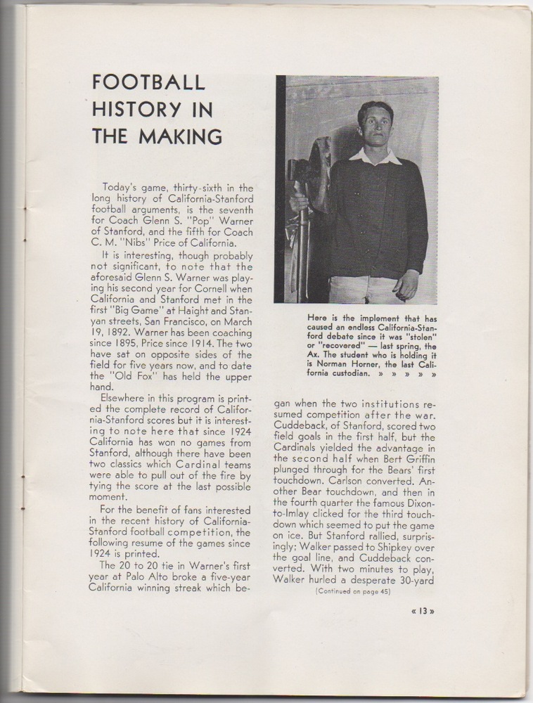 Cal kept things interesting for a half, but the Bears were no match for Stanford in a 41-0 rout. Halfback Harlow Rothert, who won three consecutive NCAA shot put titles and set the world record in the event in 1930, scored three second-half touchdowns to help Stanford improve to 8-1-1.