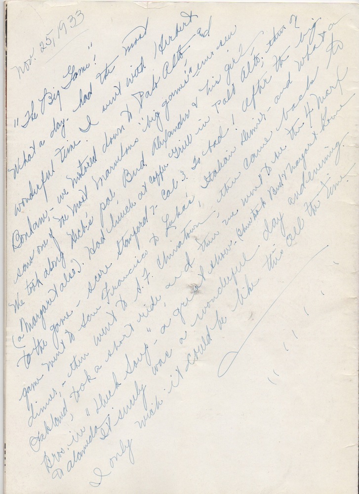 Stanford's "Vow Boys" defeated Cal 7-3 in the 1933 Big Game en route to the Rose Bowl, where they lost to Columbia.