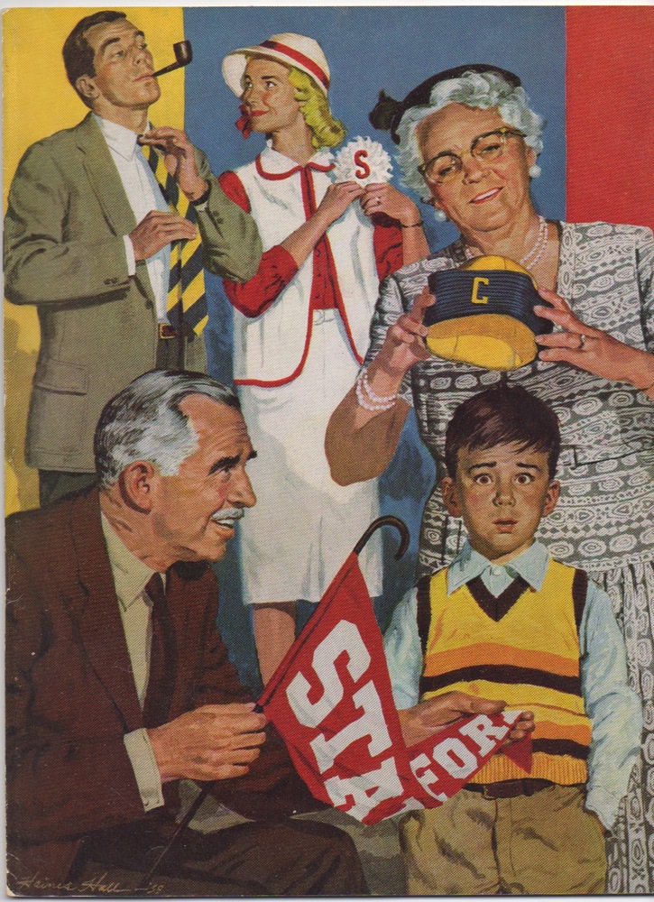 The cover of the 1959 Big Game program revives the house divided theme. This one resonates with me, as my paternal grandfather (the owner of this collection of programs) went to Stanford and my paternal grandmother went to Cal. My grandparents hosted Big Game viewing parties at their house when I was younger, which served as my introduction to the rivalry. I remember siding with my grandmother and supporting Cal because I felt bad that she was so outnumbered by all the Stanford fans in the room. Try not to hold it against me.