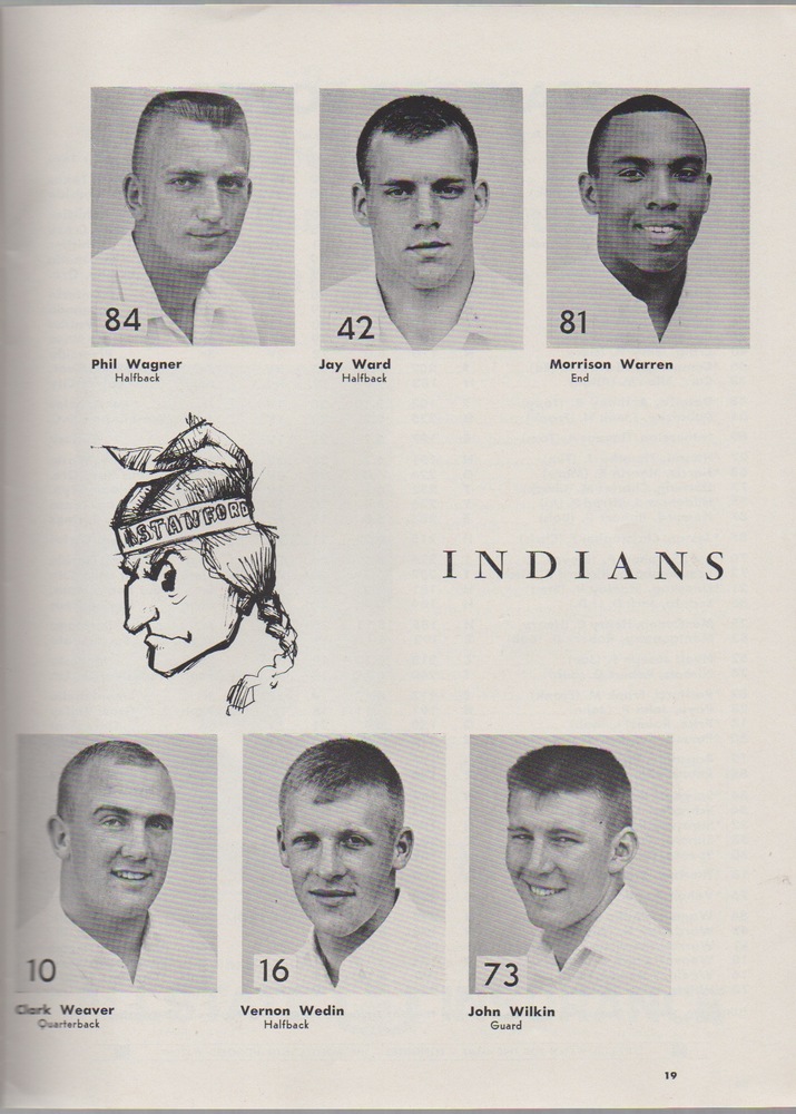 Interesting. First of these I’ve seen featuring an African-American player in the photos. That got me a little bit interested in who was the first player to break the color barrier. Apparently, it was Tom Williams in 1954. See last item in: http://www.stanfordalumni.org/news/magazine/1999/julaug/farm_report/digest.html