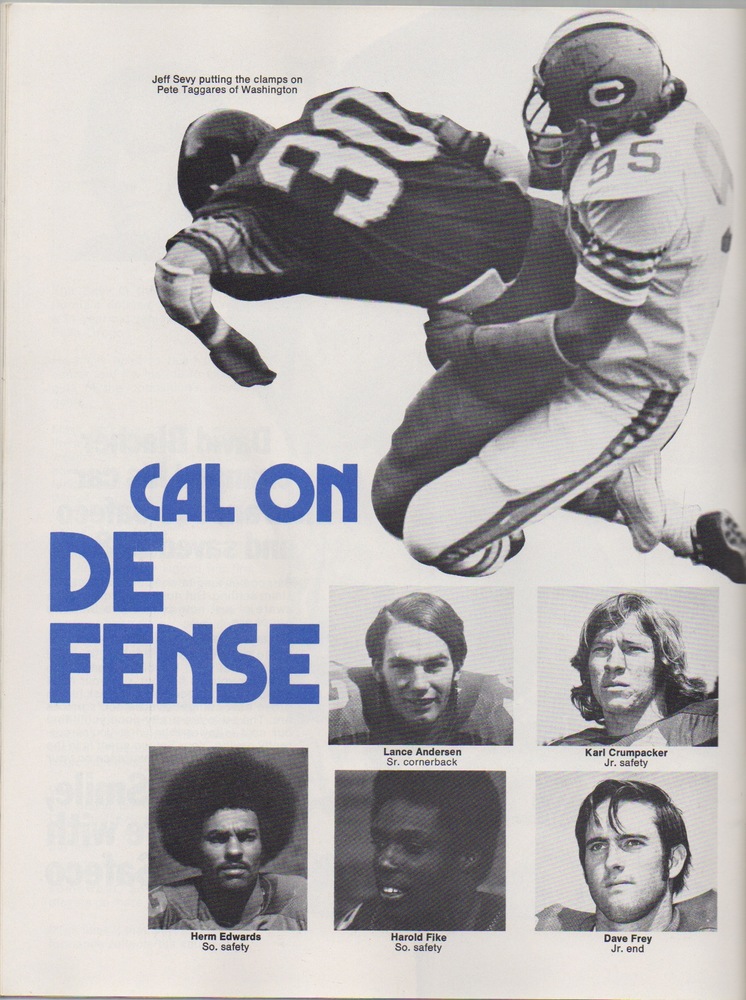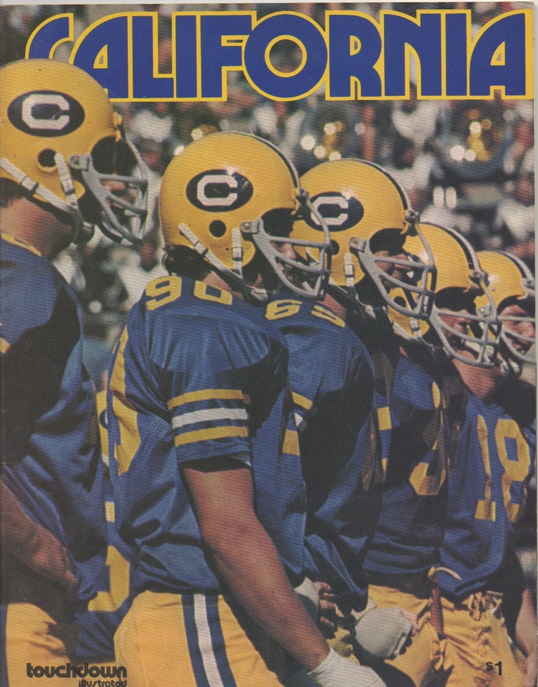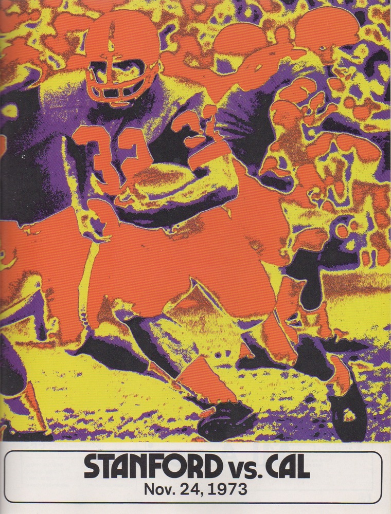 Scott Laidlaw rushed for 132 yards on 23 carries and Stanford overcame a 17-13 deficit early in the fourth quarter to win the 1973 Big Game, 26-17. I'm not a fan of the uninspired Touchdown Illustrated cover, though the Cal helmets look pretty cool. To go from the 1972 masterpiece to something like this is pretty jarring. Unfortunately, it's also a sign of things to come.