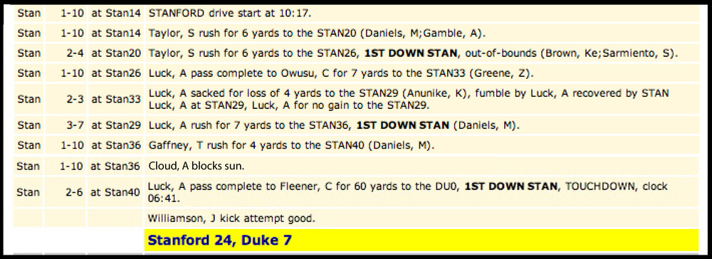 Enter a fluffy-looking mass of water vapor, which my cousin would later dub Four Touchdown Cloud. Yes, the Cardinal's fortunes changed right about the time the 1,000+ Stanford fans who made the trip to Wallace Wade Stadium could remove their sunglasses. What was a too-close-for-comfort game against an ACC bottom feeder turned into a rout. What was a hot day in Durham -- big thanks to Duke for the unlimited free ice water -- suddenly felt like Palo Alto.