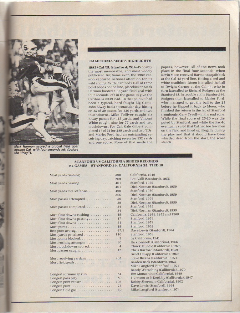 Cal quarterback Gale Gilbert threw for 263 yards and two touchdowns to lead the Bears to a 27-18 win in Paul Wiggin's last game as Stanford's head coach. Wiggin was asked to resign after Stanford lost its first six games of the season. The Cardinal won one game in 1983.