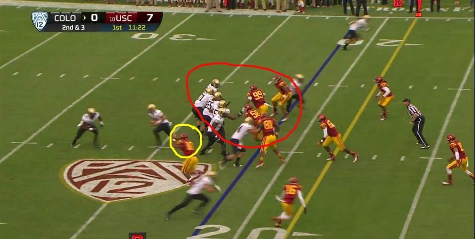 Here's an example. Early in the first quarter, Colorado sets up a first and ten in USC territory and tries to run a pass in the flat to the running back. However, the play never has a chance to work because a blitzer is able to get to the quarterback first.