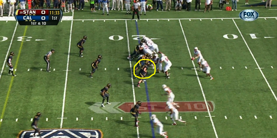 On this play, Hogan stands with Remound Wright to his left. Hogan will decide to keep the ball for himself or hand the ball to Wright based on what Cal defensive end Nathan Broussard (circled in yellow) does once the ball is snapped.