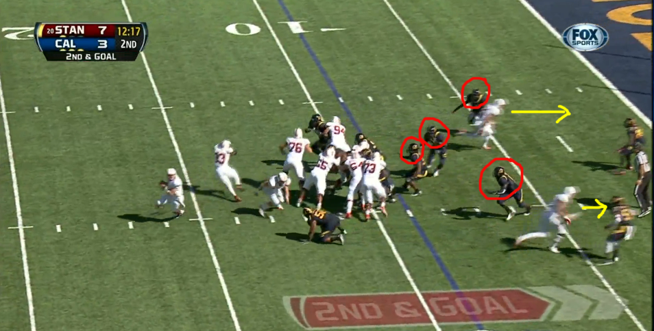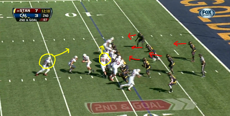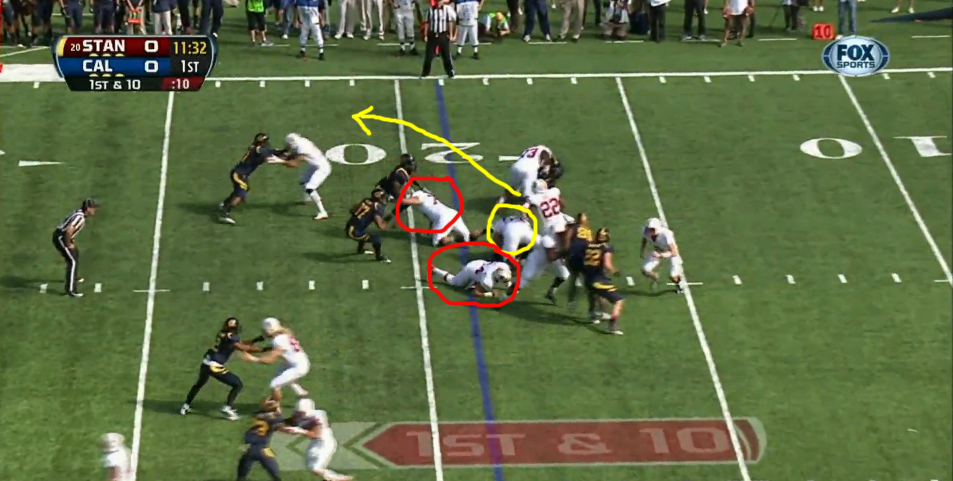 Wright gets a good lead block from David Yankey, who pulls from his left tackle spot and absolutely flattens his man (circled in yellow), and even though two other Cardinal linemen miss their blocks (circled in red), Wright has a huge hole to run through.