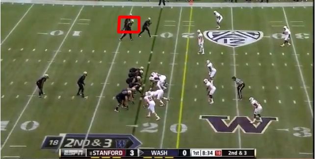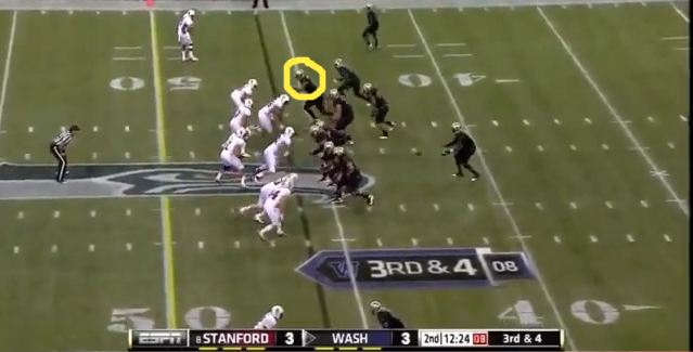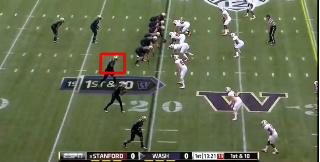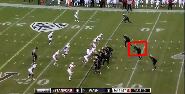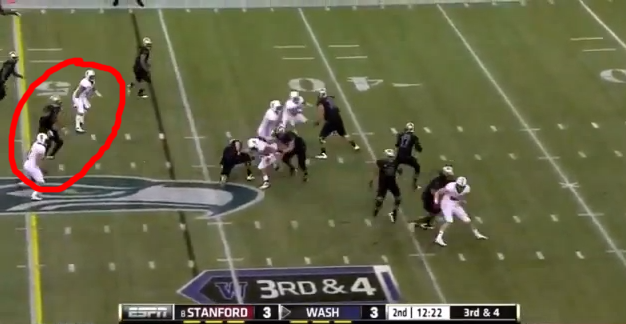 When he gets there, though, the Cardinal linebackers drop into zone coverage and bracket him, hemming him in on both sides and forcing Keith Price to look to a different option.
