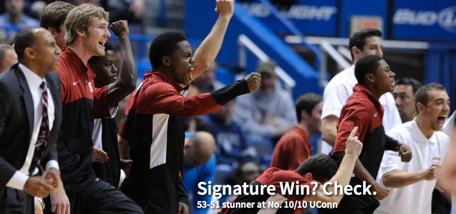 The Stanford men's basketball team had come close to picking up a "signature" win under Johnny Dawkins before, losing in overtime to No. 5 Kentucky at the 2009 Cancun Challenge and to No. 5 Syracuse at Madison Square Garden in the 2011 Preseason NIT, but they couldn't finish the job. Until last night. It wasn't pretty, but the Cardinal found a way to beat a good Connecticut team, 53-51, ending the No. 10 Huskies' 54-game home winning streak against nonconference opponents.