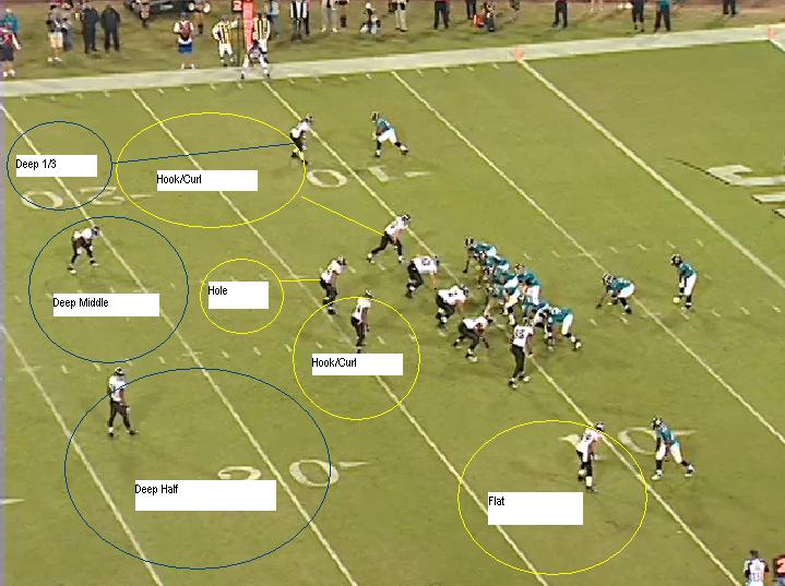 The fantastic thing about this play is that it's not all that complicated, but it's effective against almost any type of coverage if there's enough protection for the quarterback. Run this play against man coverage and you might get two defenders to run into one another. Run it against cover-2 and you might see a wide open middle of the field like in this play.