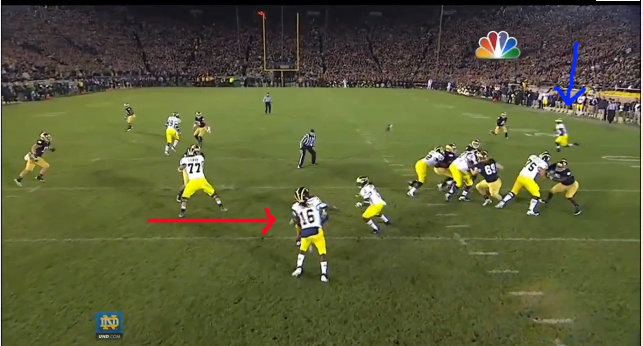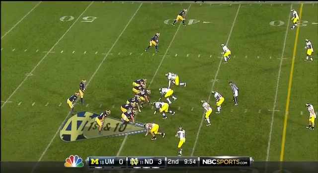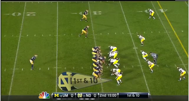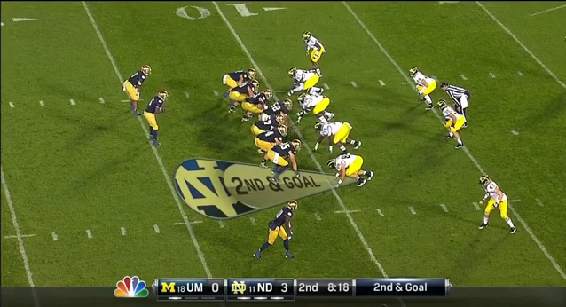 However, Michigan didn't stop the Irish runners by stacking the box and blitzing over and over again (and therefore making themselves vulnerable to play-action passes). Instead, the Wolverine defense set up with their linebackers at pretty much the same depth every time - about five yards from the line of scrimmage. As a result, Notre Dame had a lot of two-to-five yard carries, but the Irish were never able to hit a home run on the ground. Note in the images below that no matter which formation the Irish set up in, the Michigan front seven doesn't line up that much differently.