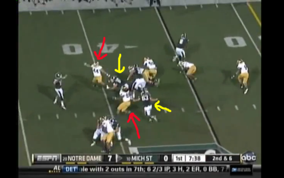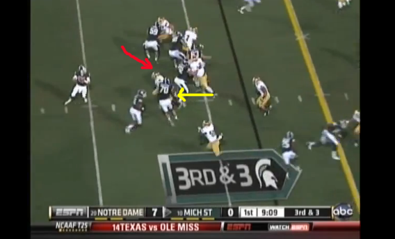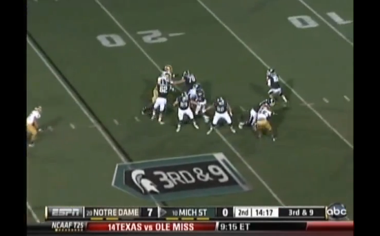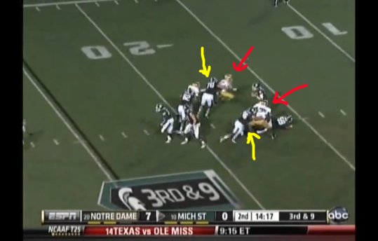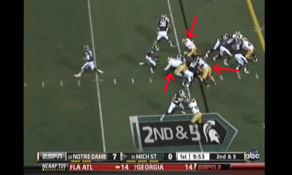 Take a look at the several different plays from the Notre Dame - Michigan State game and see how the Irish consistently penetrate the backfield and leave offensive linemen flailing after them.