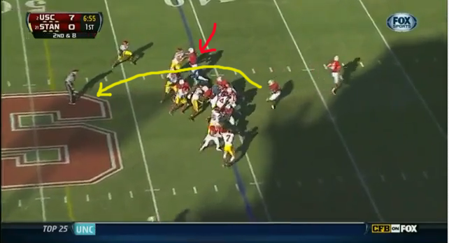 The Trojans are piled up near the line of scrimmage, but as the play develops, the Cardinal offensive line is able to get a blocker on every first-level defender and every second-level defender and push them all backwards. The only Trojan left unblocked at the snap is eventually blocked out of the play by Levine Toilolo (red arrow), who pushes his man so far up the field that it cuts off any hope for a tackle. This leaves a big lane for Taylor to cut back and run all the way to the end zone.