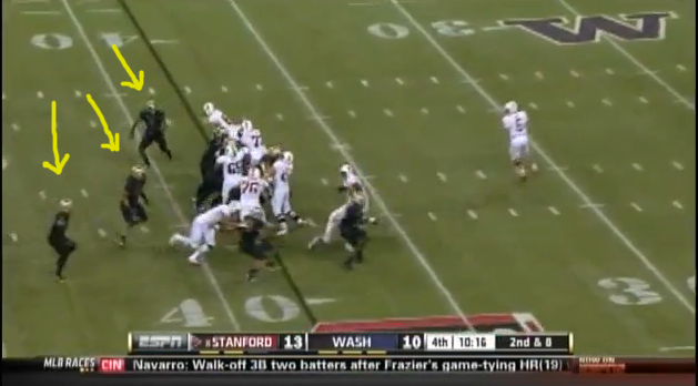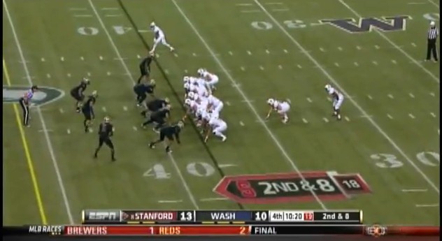 And here's the play in action. Notice how the Washington defensive line ties up the Cardinal blockers right at the line of scrimmage, leaving the Husky linebackers to roam free on the second level of the play.