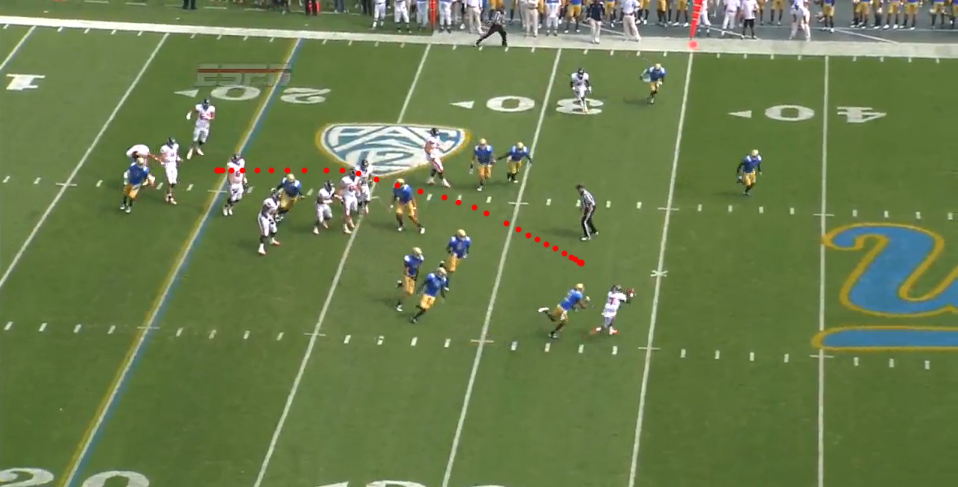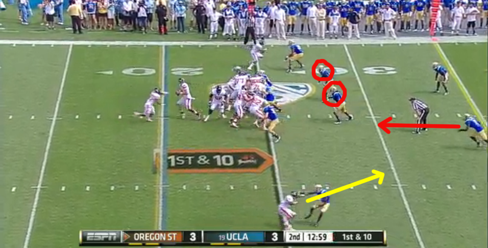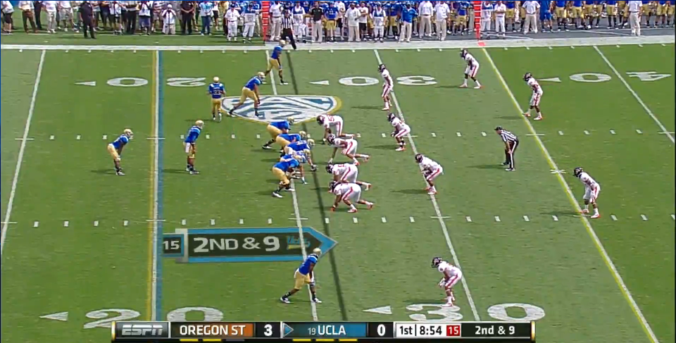 Let's look at a play from the first quarter that demonstrates what I'm talking about. Here's the pre-snap setup, with the Bruins in their normal pistol formation.