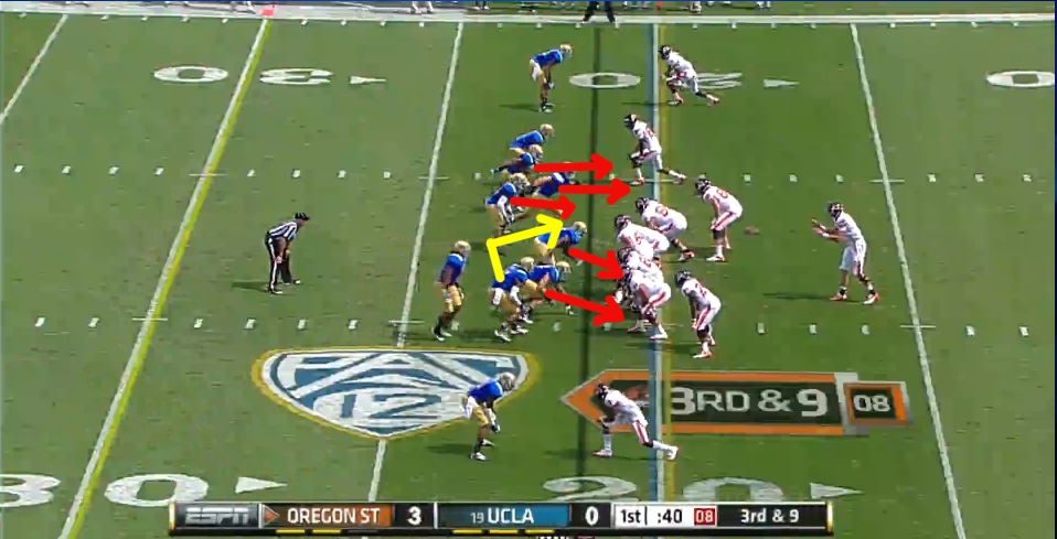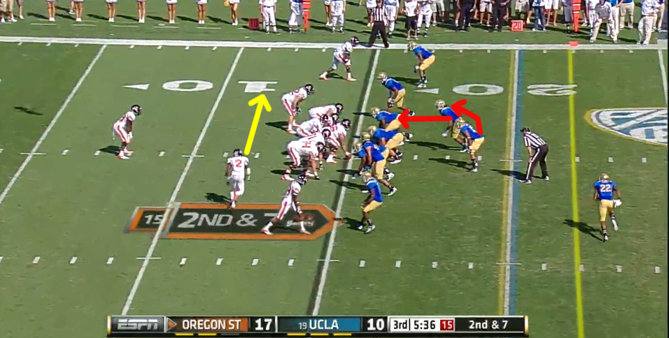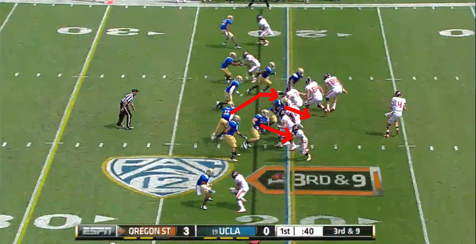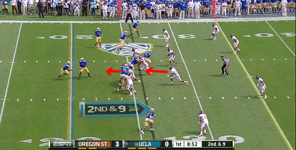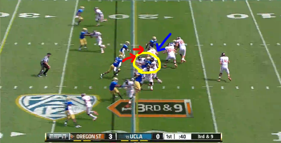 Here's another example of the exact same principle. This time, UCLA will try to run it out of the shotgun, but the Oregon State defensive tackle once again beats the Bruins' offensive linemen into the backfield.