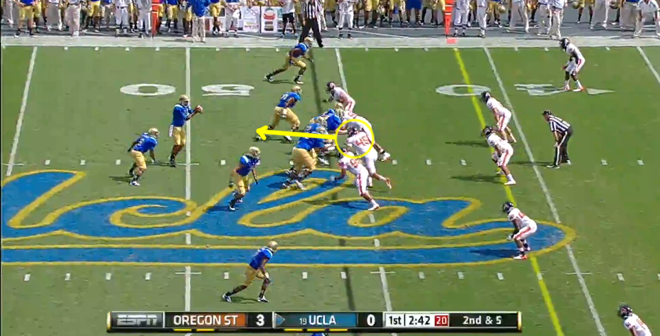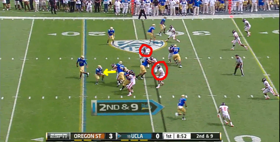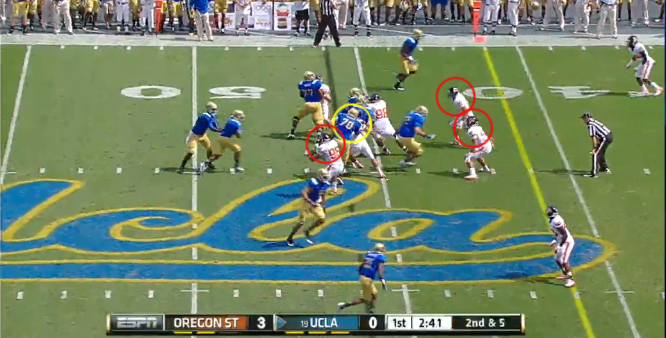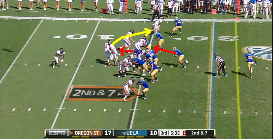 Again, notice that two linebackers are free on the second level (the lineman getting downfield will only be able to block one of them) and the OSU defensive end also comes off the snap totally free. One good play by the defensive tackle gives the other Oregon State defenders the ability to roam all over the field and stop the run.