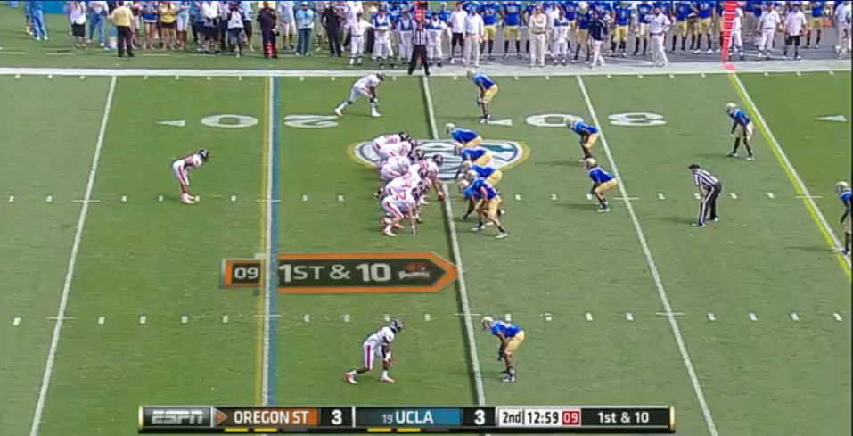 Against Oregon State, the Bruins blitzed almost 60 percent of the time, and they were eager to walk linebackers down to the line of scrimmage to try and confuse the Beavers' blocking schemes. These big blitzes naturally led to a few big plays for UCLA - and a few big plays for the Beavers.
