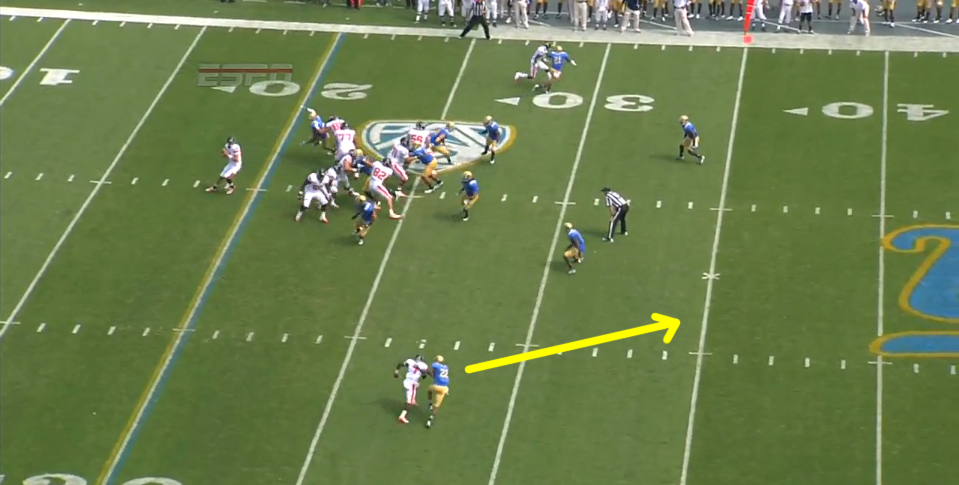 However, when Mannion stands up and looks downfield, he sees that the UCLA defense is out of position to stop the pass - the Bruins' aggression to try and stop the run means that nobody is covering deep downfield - and he hits his receiver in stride for a perfect touchdown pass.