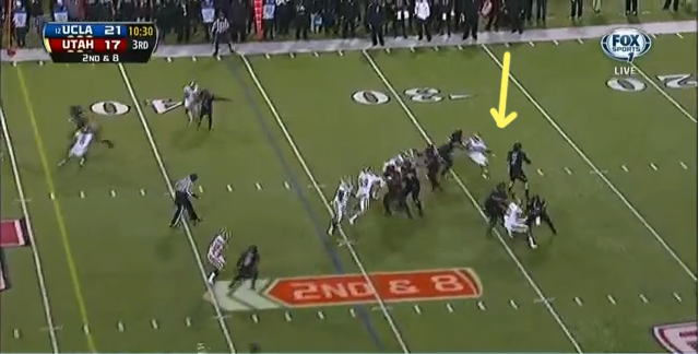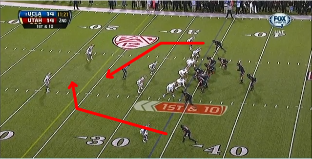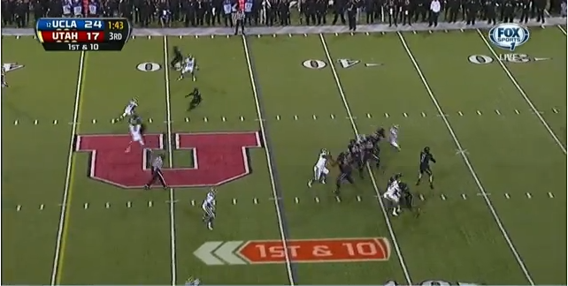 At the snap, the Utes run a quick play-action with the running back, while UCLA sends the three down linemen and the two edge rushers after the quarterback. Utah initially does a pretty good job of giving Wilson time to look downfield - except for the left guard, who lets his defender go unblocked to the running back. Then, he stands straight up. Dude, what are you doing?