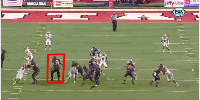 Here's Wilson's first interception of the day. Here's the pre-snap setup from above and from the quarterback's view. The two deep crossing routes the Utes run are diagrammed in red, while the guy who makes the interception, linebacker Jordan Zumwalt, is circled in yellow.
