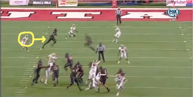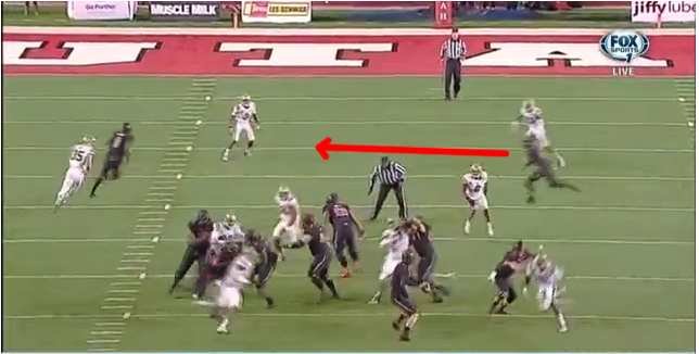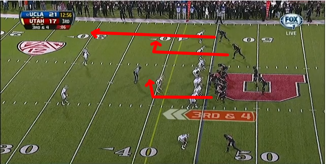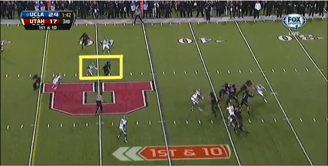 Meanwhile, Zumwalt turns and runs with the wide receiver on his side of the field while the Utes' other wideout streaks across the field on his underneath crossing route.