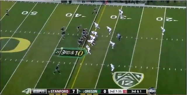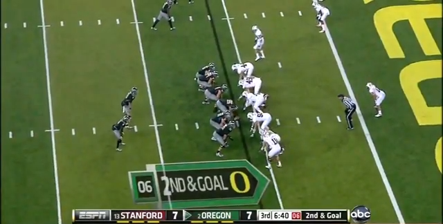 Here's an example. It's third and one, and the Ducks will try and use the inside run to pick up the first down. Stanford's two middle linebackers are set back from the line, while the two Stanford defensive ends are pinched in.