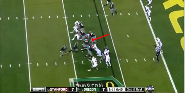 He ends up squeezing forward for a 3-yard gain, but the result is definitely a win for Stanford. This is how you stop Oregon's outside run.