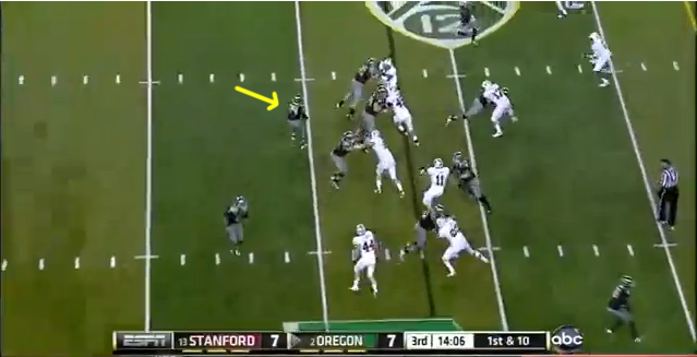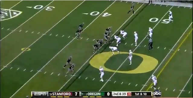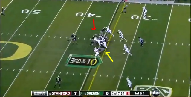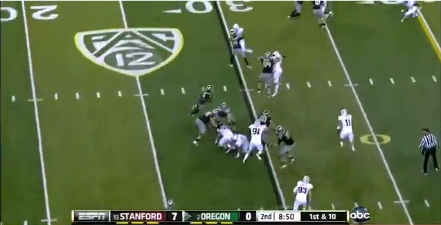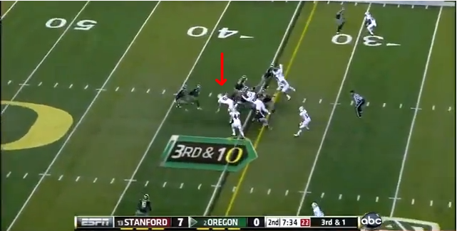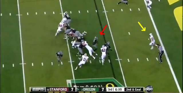 This little change in defensive alignment gave Anderson the chance to make this play and gave the Ducks fits in the interior run game all night. It also kept the Stanford linebackers free to make plays because the Ducks' o-line kept struggling with blocks up front.