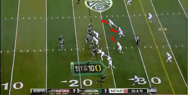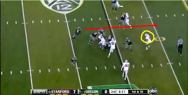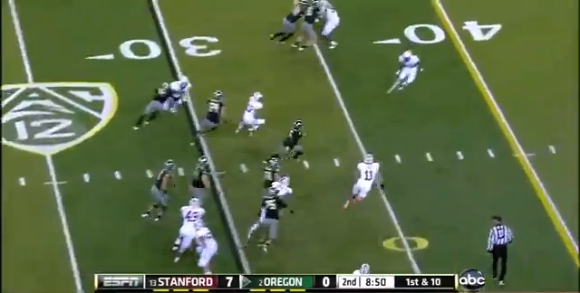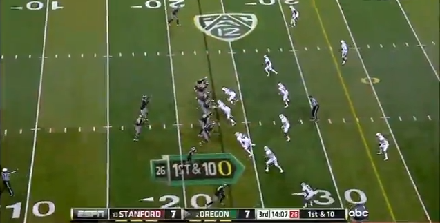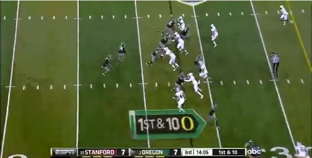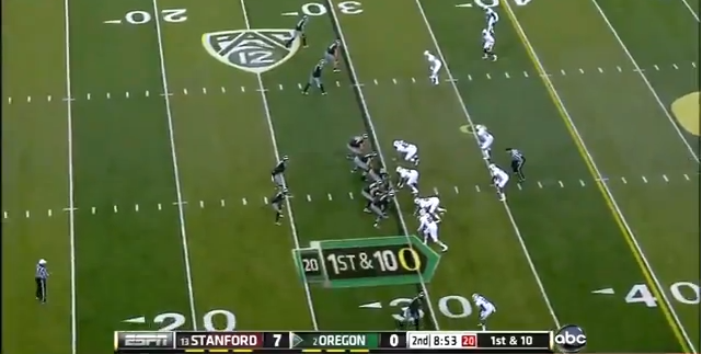 So did Stanford stop these outside run? Flawless fundamentals, and making the Ducks run game more predictable. After these two outside runs went for 20 yards, the Stanford defense held the Ducks to just 9 yards on 13 carries outside the tackles.