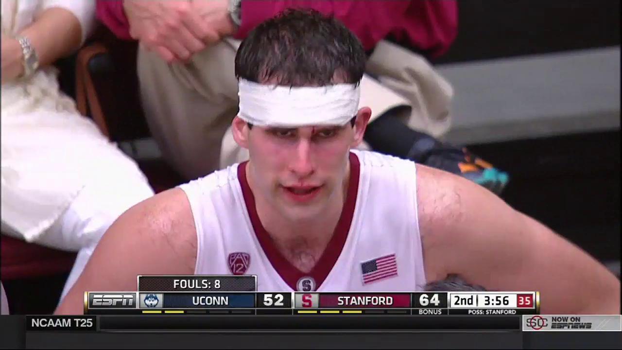 Lastly, Nastic has continued to provide Stanford with a consistent and reliable low post scoring threat (14 ppg) and rebounder (7.1 rpg). With the aforementioned Travis missing an extended period of time, the onus has been on Nastic to be a strong interior presence on both ends of the floor, and he has elevated his game accordingly. The Serbian-born center has also added a positive intangible element to the team, as he is a favorite among the fans at Maples Pavilion, and often displays tremendous toughness and grit on the court. This was never more evident than when the big man got struck in the forehead against Uconn and closed out the win against Uconn rocking this look: